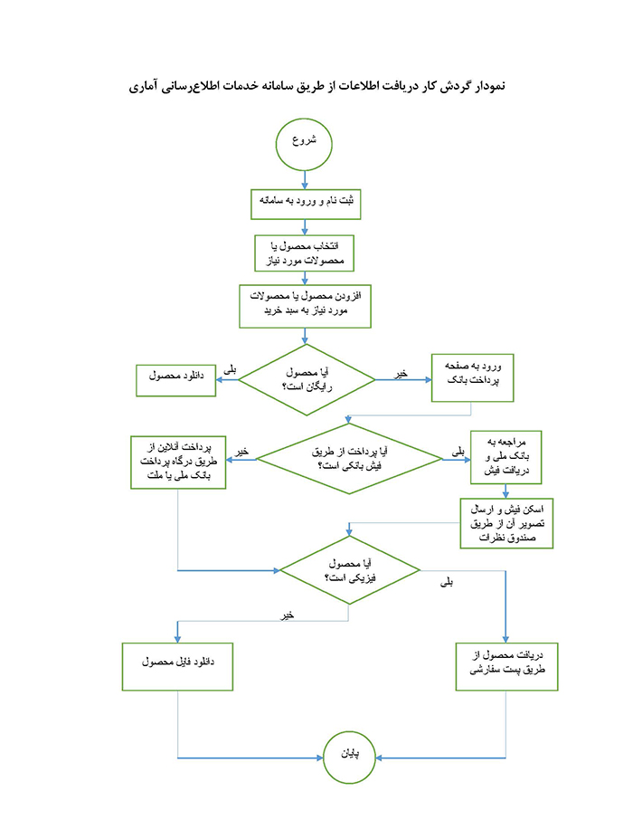 مراحل انجام خدمت: ورود به سامانه خدمات اطلاعرسانی آماری از طریق درگاه ملی آمار،- انتخاب و سفارش محصول توسط مشتری،- ثبت مشخصات مشتری،- پرداخت هزینه (بهصورت الکترونیکی)،- دریافت محصول (از طریق دانلود فایل یا از طریق پست)