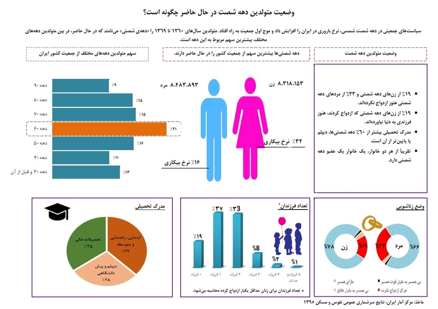 اطلاعنگاشت وضعیت متولدین دهه 60 منتشر شد. متولدین سالهای 1360 تا 1369 را «دههی شصتی» مینامند که در حال حاضر، در بین متولدین دهههای مختلف، بیشترین سهم جمعیت کشور مربوط به متولدین این دهه است. در این اطلاعنگاشت، سهم جمعیت دهه شصت به همراه نرخ بیکاری، وضعیت مدرک تحصیلی، وضع زناشویی و تعداد فرزندان متولدین این دهه به نمایش درآمده است. در این اطلاعنگاشت مشاهده می شود كه 19 درصد از زنهای دهه شصتی و 33 در صد از مردهای دهه شصتی هنوز ازدواج نکردهاند و 19 درصد از زنهای دهه شصتی که ازدواج کردند، هنوز فرزندی به دنیا نیاوردهاند. همچنین مدرک تحصیلی بیشتر از 60 درصد از دهه شصتیها، دیپلم یا پایینتر از آن است.