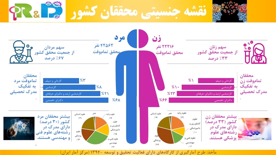 براساس طرح آمارگیری از كارگاههای دارای فعالیت تحقیق و توسعه -1394 ،42562 محقق تمام وقت مرد و 22216 نفر محقق تمام وقت زن در كشور فعالیت می كنند. به عبارت دیگر مردان سهم 67 درصدی از جمعیت محقق كشور و زنان سهم 33 درصدی از جمعیت محقق كشور را دارند. علاوه بر این بیشتر محققان زن یعنی 33 در صد از آنان دارای مدرك علوم پزشكی هستند. همچنین بیشتر محققان مرد یعنی 30 در صد دارای مدرك در رشته های علوم فنی و مهندسی هستندكه 66 در صد از محققان زن و 68 در صد از محققان مرد دارای دكترای تخصصی می باشند.