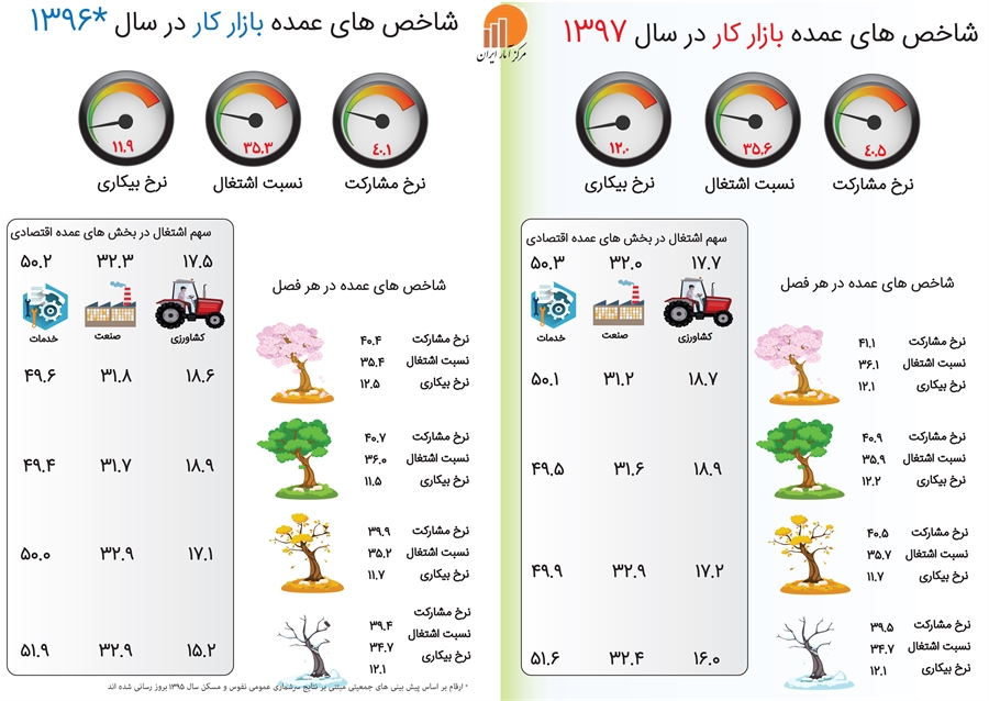 در اطلاعنگاشت حاضر، نتایج طرح آمارگیری از نیروی کار برای جمعیت 10 ساله و بیشتر در سال1396 و 1397 مقایسه شده است. بر اساس نتایج بدست آمده تغییرات محسوسی در سه نرخ بیکاری، نسبت اشتغال و نرخ مشارکت اقتصادی بین دو سال دیده نمیشود. همچنین الگو نسبت اشتغال در بخشهای کشاورزی، صنعت و خدمات ( از کمترین به بیشترین) با حدود 17.5 % ، 32% و 50% دارای تغییر محسوسی نیست. همچنین تغییرات الگوی این سه شاخص مهم بازار کار در طی فصول مختلف در طی دو سال یکسان است. بیشترین نرخ مشارکت اقتصادی در هر دوسال در فصل تابستان، نسبت اشتغال در فصل بهار 1397 و فصل تابستان 1396 دارای بیشترین در طی سال بوده اند و نرخ بیکاری در پاییز 1397 با 11.7 و در تابستان 1396 با 11.5 دارای کمترین نرخ در بین فصول در سالهای مذکور بودهاند.