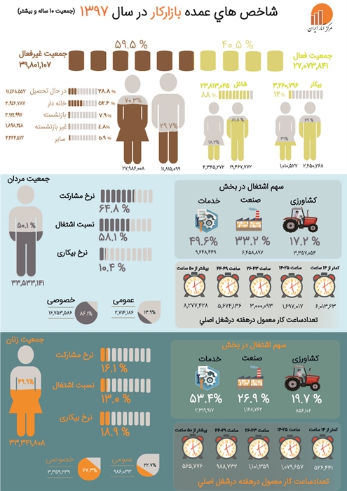 در اطلاعنگاشت حاضر، نتایج طرح آمارگیری از نیروی کار برای جمعیت 10 ساله و بیشتر در سال 1397 نشان داده شده است. بر اساس نتایج بدست آمده از جمعیت فعال 27073841 تعداد 23813045 شاغلین هستند که 81.8% آن را مردان و18.2% را بانوان تشکیل دادهاند. همچنین تعداد 3260796 نفر از جمعیت فعال بیکار بودهاند که 69% آن را مردان و 31% آن را بانوان تشکیل دادهاند.