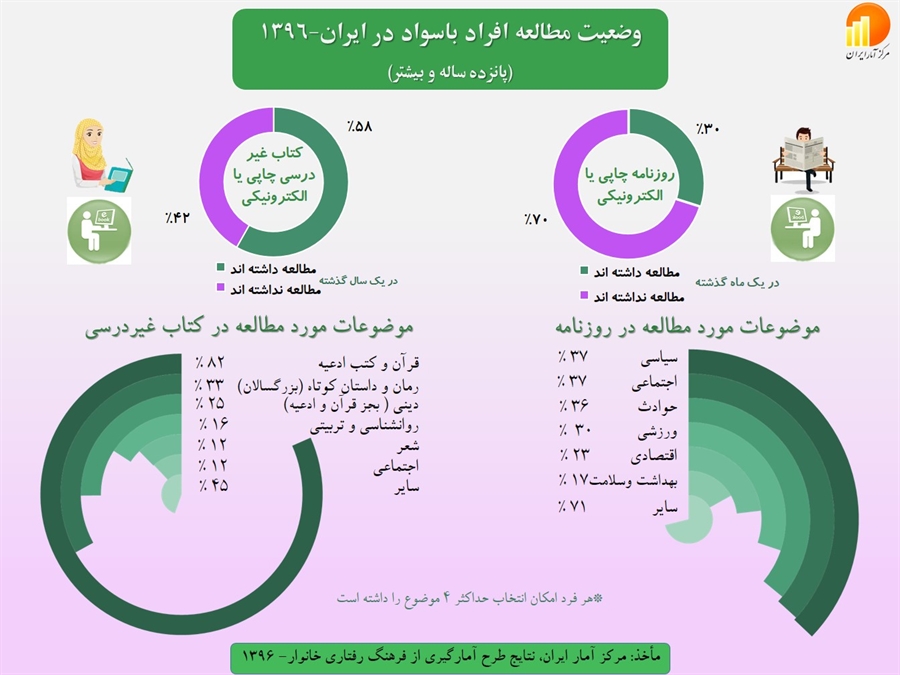 در  این دو اطلاعنگاشت "وضعیت مطالعه افر اد باسواد در ایران" و "سرانه مطالعه روزانه هر ایرانی  با سواد 15 ساله و بیشتر" به تصویر كشیده شده است.