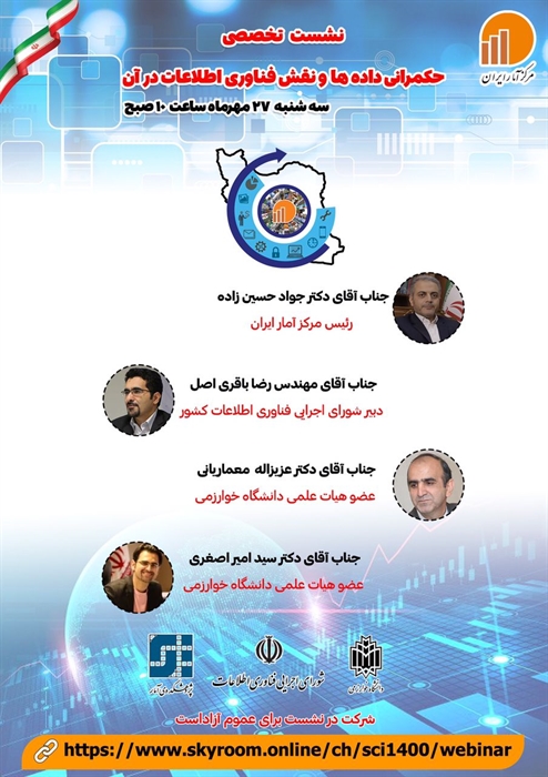 این نشست با حضور دکتر جواد حسین زاده، رئیس مرکز آمار ایران،  مهندس رضا باقری اصل دبیر شورای اجرایی فناوری اطلاعات کشور، دکتر عزیز اله معماریانی، عضو هیئت علمی دانشگاه خوارزمی دکتر سید امیر اصغری،عضو هیئت علمی دانشگاه خوارزمی برگزار می شود.