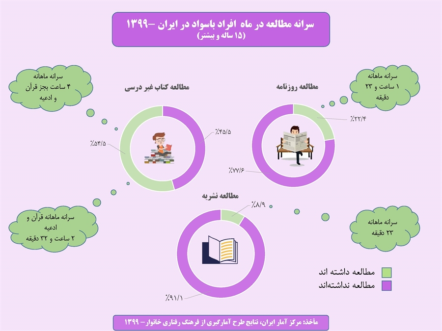 اطلاع نگاشت سرانه مطالعه در ماه افراد با سواد در ایران -1399 (15 ساله و بیشتر)