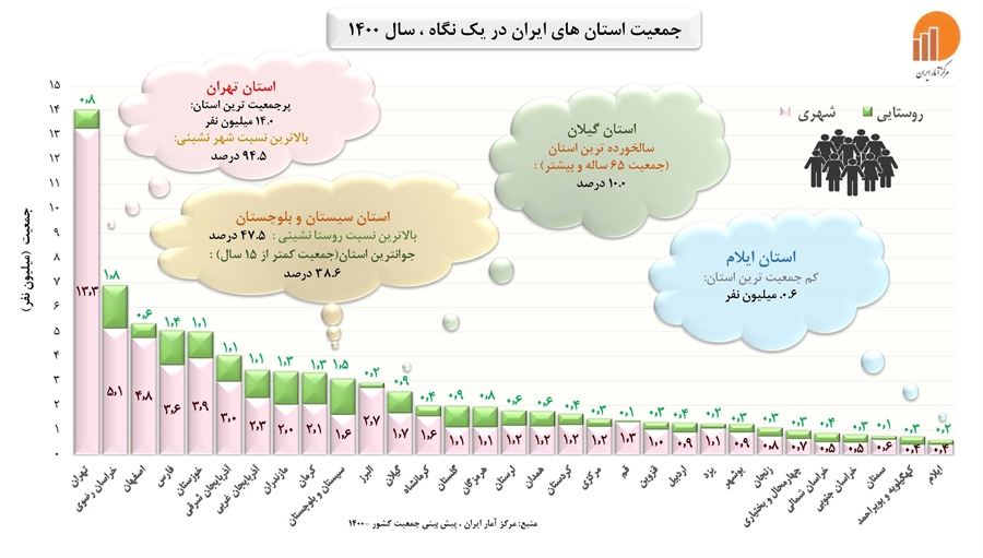 اطلاع نگاشت تهیه شده در دفتر جمعیت، نیروی کار و سرشماری با عنوان "جمعیت استانهای ایران در یک نگاه، سال 1400" آخرین وضعیت جمعیتی کشور در سال 1400 را به تصویر کشیده است. بر اساس این اطلاع نگاشت، استان تهران با 14 میلیون نفر جمعیت پرجمعیتترین استان و استان ایلام با 0.6 میلیون نفر کم جمعیتترین استان در سال 1400 بوده است. بعد از استان تهران استانهای خراسان رضوی و اصفهان بیشترین جمعیت را دارند و بعد از استان ایلام استانهای کهگیلویه و بویراحمد و سمنان کمترین جمعیت را داشتهاند.