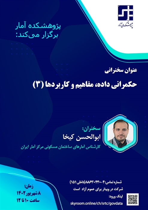2- -«حکمرانی داده، مفاهیم و کاربردها (3)» توسط آقای ابوالحسن کیخا، کارشناس آمارهای ساختمان مسکونی مرکز آمار ایران در روز چهارشنبه مورخ 08/06/1402 ساعت 10 تا 12 به آدرس (skyroom.online/ch/srtc/govdata)
