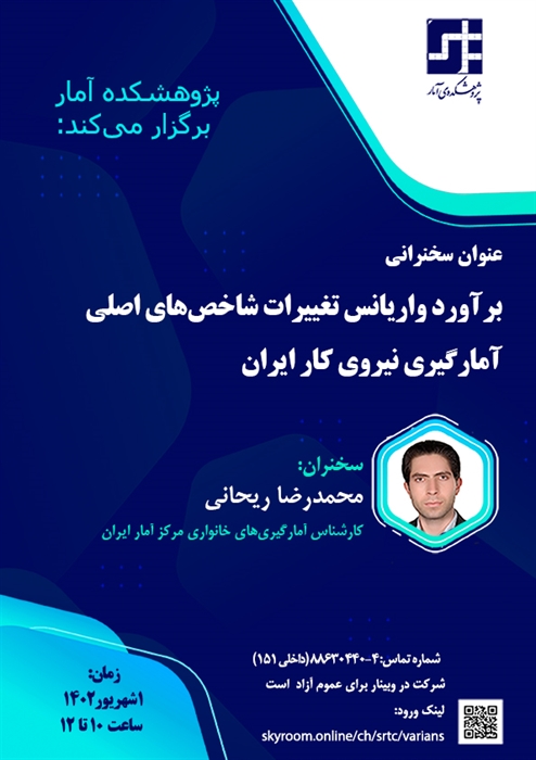 1-«برآورد واریانس تغییرات شاخصهای اصلی آمارگیری نیروی کار ایران» توسط آقای محمدرضا ریحانی، کارشناس آمارگیریهای خانواری مرکز آمار ایران در روز چهارشنبه مورخ 01/06/1402 ساعت 10 تا 12 به آدرس (skyroom.online/ch/srtc/variance)