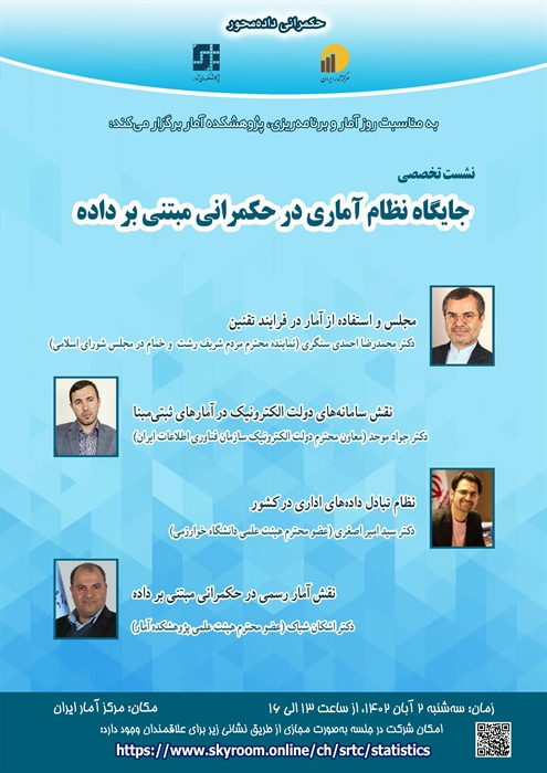 نشست تخصصیجایگاه نظام آماری در حکمرانی مبتنی بر داده، سه‌شنبه ۲ آبان ۱۴۰۲ ساعت ۱۳ الی ۱۶