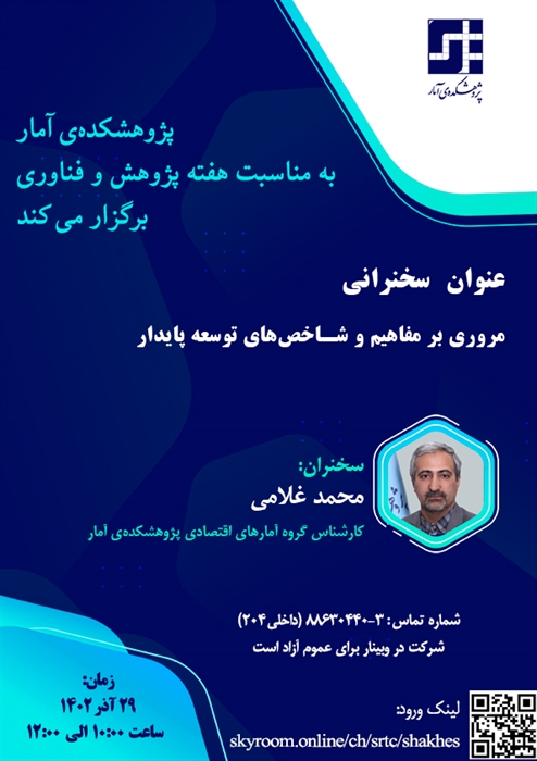 پژوهشکدهی آمار در نظر دارد به مناسبت هفته پژوهش و فناوری سخنرانی علمی با عنوان «مروری بر مفاهیم و شاخصهای توسعه پایدار» به صورت مجازی برگزار نماید.